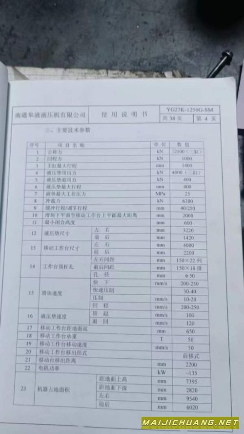 南通皋液框架1250吨液压机台面2.2/4米多点顶出移动台,安装少用,在位出售,可试机_ 信息编号:S471875 |